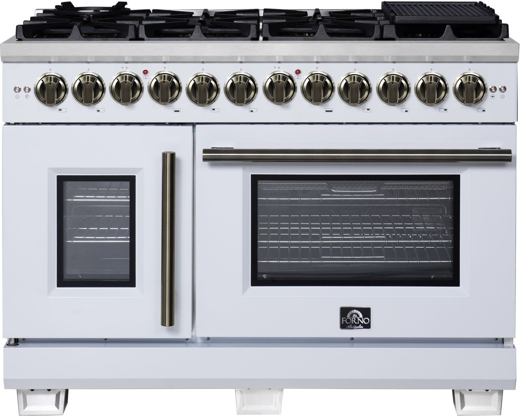 The Forno Capriasca 48 Inch French Door Dual Fuel Range in white with antique brass accents combines professional styling with powerful performance for the home kitchen. Its French door design provides up to 12 inches of extra clearance, making it easier to load and access the oven.Read More