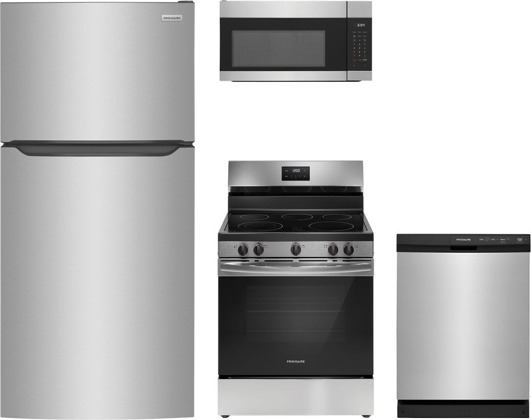 KitchenAid® 4 Piece Stainless Steel Kitchen Package with a Top Freezer refrigerator, Freestanding electric range, over the range microwave and built in dishwasher.Read More